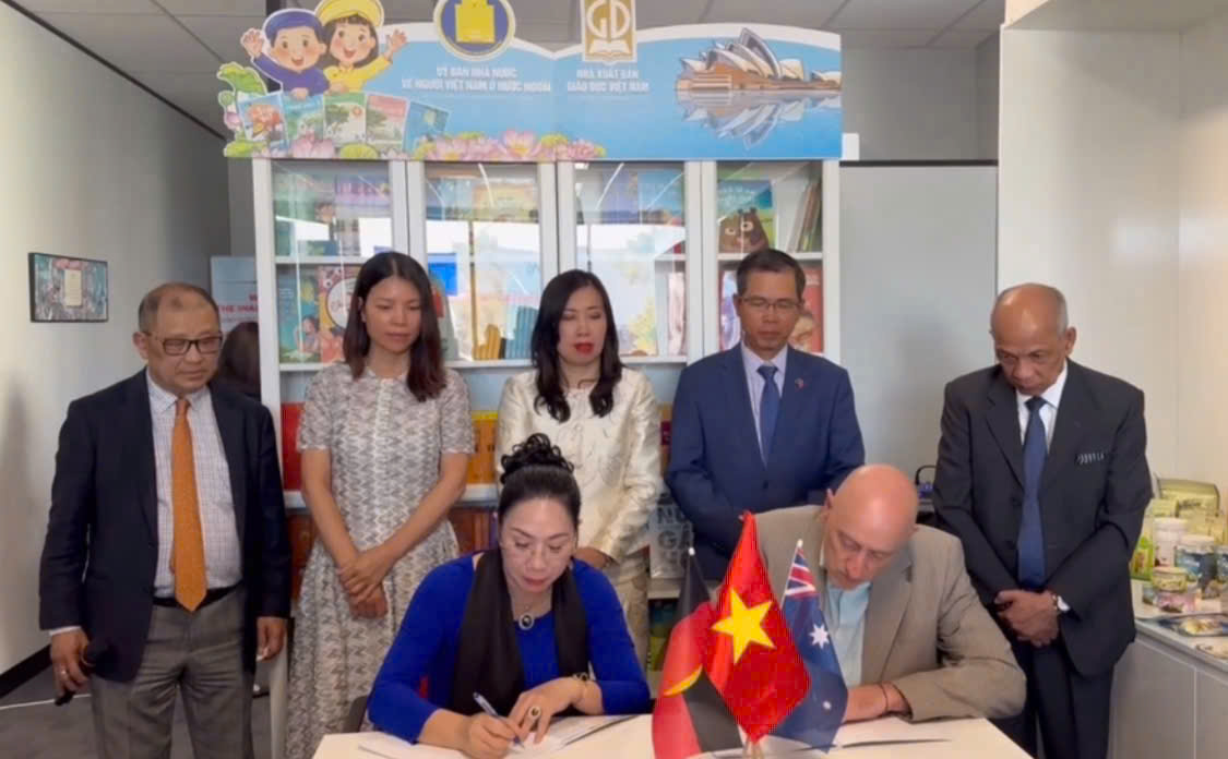 Bà Nguyễn Thị Hồng Thắm đại diện Viên Pháp Luật KInh Tế Doanh Nghiệp kí kết với đại diện doanh nghiệp Úc dưới sự chứng kiến của thứ trưởng Bộ Ngoại Giao Nguyễn Thị Thu Hằng và luật sư Trần Bá Phúc ủy viên ủy ban MTTQ Việt Nam chủ tịch hội doanh nhân Việt Nam tại Úc.
